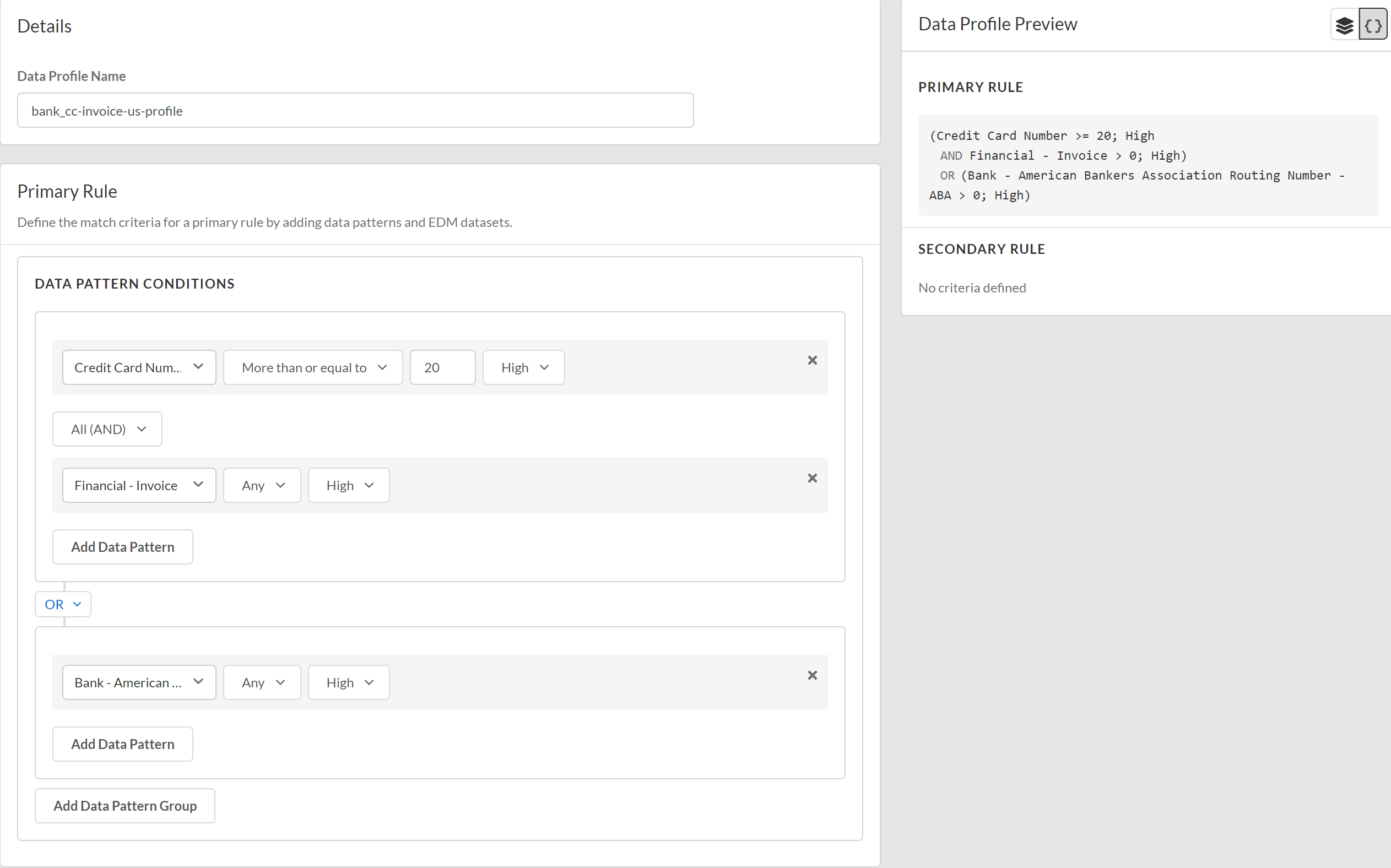 (Optional) Configure a Secondary Rule.Data pattern match criteria added to the Secondary Rule block all traffic that meets the match criteria for the data pattern conditions. If you want to allow traffic that matches a data pattern match criteria, add it to the Primary Rule.Review the Data Profile Preview to verify the data profile match criteria.Click Test Run to test and verify the data profile accurately detects the sensitive data you configured it to detect.Save the data profile.In Data Profiles, search for the data profile you created to verify it was successfully created.Modify a DLP rule to attach the data profile to a Security policy rule.The DLP rule defines the type of traffic to inspect, the impacted file types, action, log severity, and more for the data profile match criteria. Enterprise DLP automatically creates a DLP rule with an identical name as the data profile from which it was created.