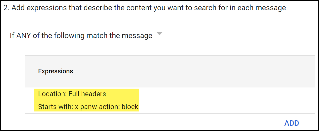 Configure email forwarding to Enterprise DLP for emails that have not been inspected.- In the Add experiences that describe the content you want to search for in each message section, select If ANY of the following match the message.