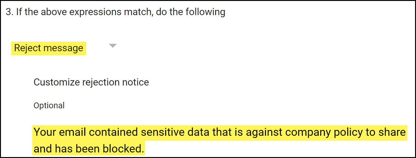 Configure the action Gmail takes for emails that are blocked.- In the If the above expressions match, do the following section, select Reject message.