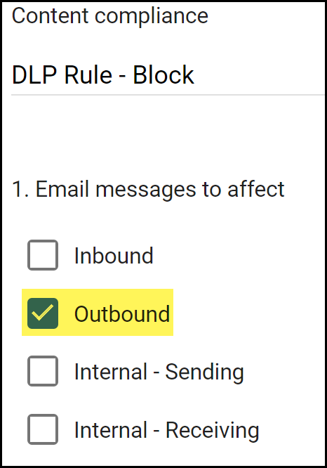 Configure the email transport rule.- In the Content compliance field, enter a descriptive name for the transport rule.For the Email messages to affect, select Outbound.This instructs Gmail to forward the email to Enterprise DLP before it leaves your network when the email recipient is outside your organization.