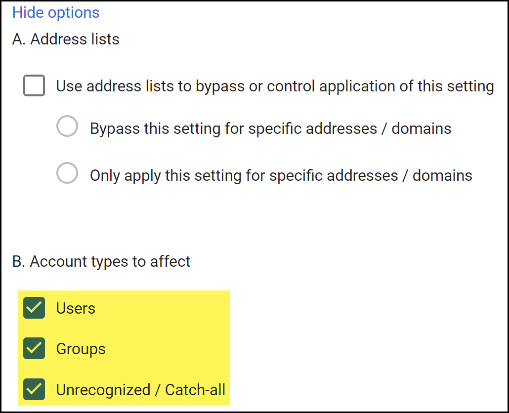 Configure the types of Gmail accounts the transport rule affects.- Show Options.After you expand the options menu, the button displays Hide Options.