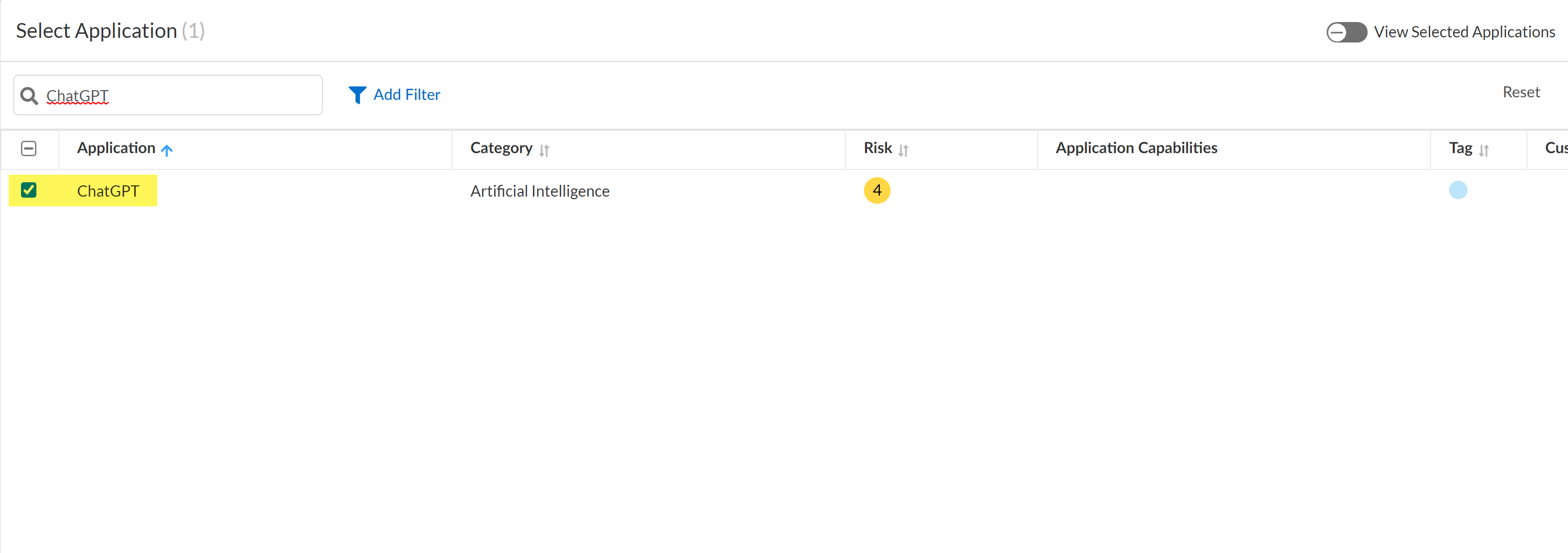 Modify the Action and Log Severity.Modify the rest of the DLP rule as needed.Save.Select ConfigurationSaaS SecurityDiscovered AppsPolicy Recommendations to create a Security policy rule recommendation.A SaaS policy rule recommendation is required to leverage the Enterprise Data Loss Prevention (E-DLP) data profile in SaaS Security.- In the Select Applications section, search for and select ChatGPT.