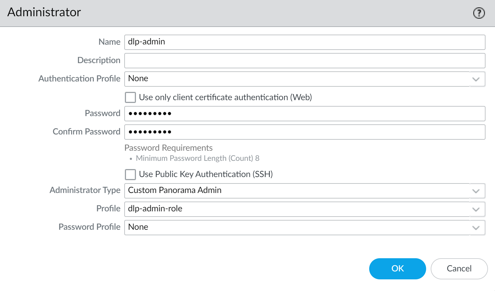 Configure any additional admin role access privileges as needed.For example, you can enable Push All Changes, CommitPanorama, and Tasks to allow the administrator to commit and push Enterprise DLP changes from Panorama to managed firewalls and then view the job status in the Task Manager.Click OK.Create an Enterprise DLP administrator account.Skip this step if you modified an existing admin role already associated with an administrator account.- Select PanoramaAdministrator and Add a new administrator.Enter a descriptive Name for the Enterprise DLP administrator account.Configure the authentication method for the administrator account using one of the following methods.
