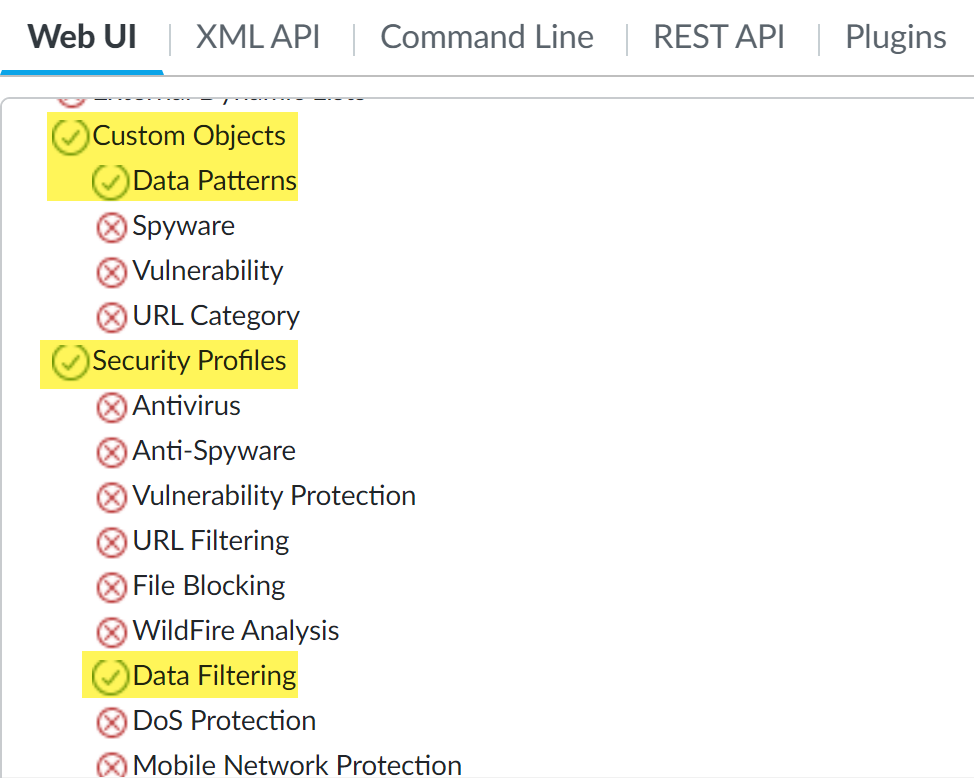 - PanoramaPlugins—Access privileges to upgrade the Enterprise DLP plugin on Panorama and read and write access to the Enterprise DLP snippets settings.If you have other Panorama plugins installed, this will enable access to those configuration nodes in the Panorama tab as well.