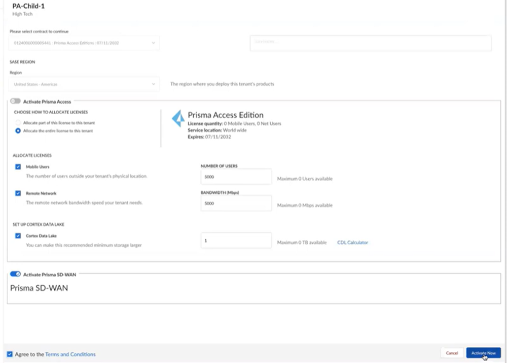 You’ll see that Prisma Access and the region are grayed out because they’re already activated, so select Activate Prisma SD-WANAgree to the terms and conditionsActivate Now.