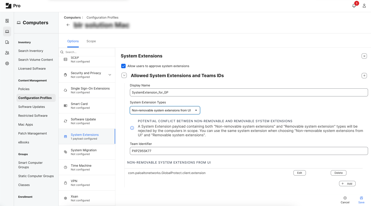 Enter the Team Identifier for the GlobalProtect app (PXPZ95SK77).Save the configuration profile.After you enable the Non-removable system extensions from UI, end users cannot disable the GlobalProtect system extension.