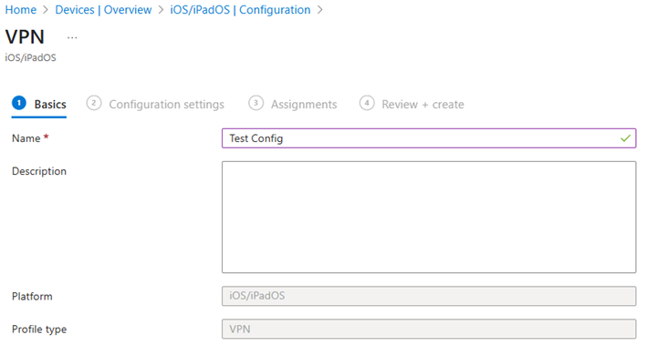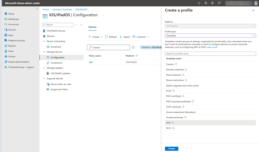 - On the Microsoft Intune admin center, navigate to DevicesiOS/iPadOS devicesConfiguration.Click CreateNew Policy.Set the Profile type to Templates and select VPN as the template name.Click Create.