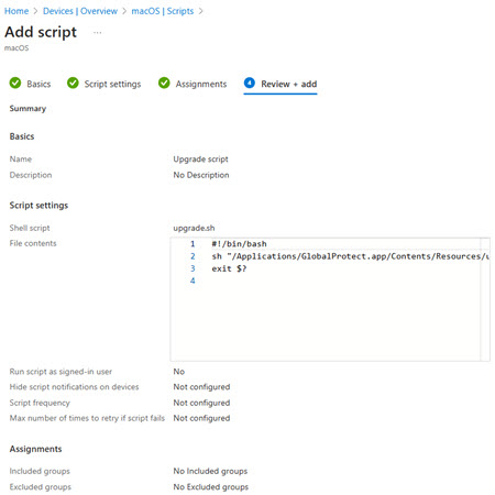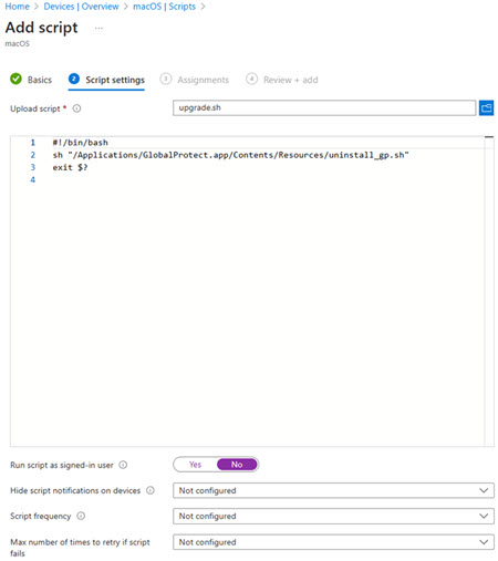 - Un-assign the users and groups that the GlobalProtect app is currently assigned to.Add the following text to a text editor and save it on your computer as an .sh file:#!/bin/bash sh "/Applications/GlobalProtect.app/Contents/Resources/uninstall_gp.sh" exit $?On the Microsoft Intuit admin center, navigate to DevicesmacOSScripts.Click Add.Type a name and description for the script and click Next.![]() Add a description and click Next.Upload the upgrade script you created in step 2.Set Run script as signed-in user to No.This enables the system to run the script as root user. Add a description and click Next.Upload the upgrade script you created in step 2.Set Run script as signed-in user to No.This enables the system to run the script as root user.![]() Specify additional information as required and click Next.Make user assignments for the new GlobalProtect app version and click Next.Review the script summary and click Add. Specify additional information as required and click Next.Make user assignments for the new GlobalProtect app version and click Next.Review the script summary and click Add.![]()