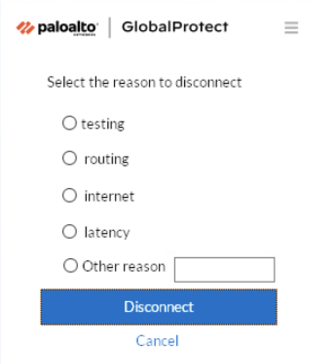 - Select the reason to disconnect—If your configuration requires you to respond to one or more reasons or enter another reason, the GlobalProtect app displays the reasons as soon as you select Disconnect.