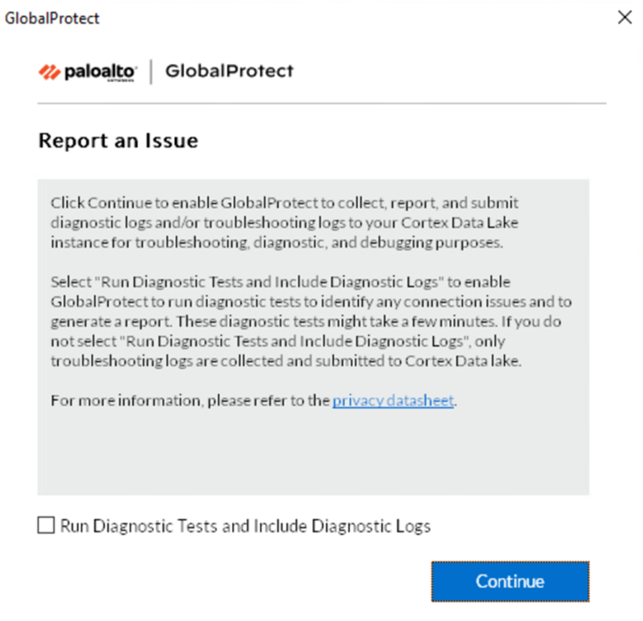 Enable the GlobalProtect app to run diagnostic tests and to include diagnostic logs. Both diagnostic and troubleshooting logs are collected and sent to Strata Logging Service as a compact troubleshooting report.After the diagnostic tests are successfully completed, the GlobalProtect debug log files are uploaded to Strata Logging Service from your endpoint.If you do not enable the app to run diagnostic tests and to include diagnostic logs, only troubleshooting logs are collected and sent to Strata Logging Service as a compact troubleshooting report. The GlobalProtect app checks for the report files (pan_gp.trb.log or pan_gp_trbl.log) that are automatically generated in .json format. A notification message appears if no issues were found in the troubleshooting logs. Click Retry to check if the pan_gp.trb*.log files exist.Select the Run Diagnostic Tests and Include Diagnostic Logs check box.Click Continue to allow the app to create a troubleshooting log and to send the report to your administrator’s Strata Logging Service instance.The results of the end-to-end diagnostic tests are stored in the pan_gp_diag.log file in .json format and sent to your administrator’s Strata Logging Service instance along with the pan_gp.trb*.log files. The GlobalProtect app can run diagnostic tests with a tunnel or without a tunnel. For example, you might want to enter your GlobalProtect login credentials prior to the app connecting and running diagnostic tests through the tunnel.