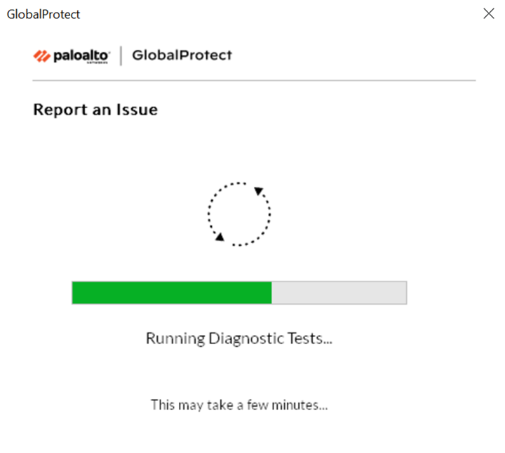 - Connect to the GlobalProtect portal or gateway.- Launch the GlobalProtect app by clicking the system tray icon. The status panel opens.(Optional) If you are logging in to the GlobalProtect app for the first time, enter the FQDN or IP address of the GlobalProtect portal, and then click Connect.(Optional) If multiple portals are saved on your app, select a portal from the Portal drop-down. By default, the most recently connected portal is pre-selected from the Portal drop-down.(Optional) By default, you are automatically connected to the Best Available gateway, based on the configuration that the administrator defines and the response times of the available gateways. To connect to a different gateway, click the gateway drop-down.Open the GlobalProtect app.Click the GlobalProtect system tray icon to launch the app interface.Report an issue from the GlobalProtect app from your endpoint.After you launch the app, click the hamburger menu on the status panel to report an issue to your administrator.- Select Report an Issue.![]() Enable the GlobalProtect app to run diagnostic tests and to include diagnostic logs. Both diagnostic and troubleshooting logs are collected and sent to Strata Logging Service as a compact troubleshooting report.After the diagnostic tests are successfully completed, the GlobalProtect debug log files are uploaded to Strata Logging Service from your endpoint.If you do not enable the app to run diagnostic tests and to include diagnostic logs, only troubleshooting logs are collected and sent to Strata Logging Service as a compact troubleshooting report. The GlobalProtect app checks for the report files (pan_gp.trb.log or pan_gp_trbl.log) that are automatically generated in .json format. A notification message appears if no issues were found in the troubleshooting logs. Click Retry to check if the pan_gp.trb*.log files exist.Select the Run Diagnostic Tests and Include Diagnostic Logs check box.Click Continue to allow the app to create a troubleshooting log and to send the report to your administrator’s Strata Logging Service instance.The results of the end-to-end diagnostic tests are stored in the pan_gp_diag.log file in .json format and sent to your administrator’s Strata Logging Service instance along with the pan_gp.trb*.log files.The results of the end-to-end diagnostic tests are stored in the pan_gp_diag.log file in .json format and sent to your administrator’s Strata Logging Service instance along with the pan_gp.trb*.log files. The GlobalProtect app can run diagnostic tests with a tunnel or without a tunnel. For example, you might want to enter your GlobalProtect login credentials prior to the app connecting and running diagnostic tests through the tunnel. Enable the GlobalProtect app to run diagnostic tests and to include diagnostic logs. Both diagnostic and troubleshooting logs are collected and sent to Strata Logging Service as a compact troubleshooting report.After the diagnostic tests are successfully completed, the GlobalProtect debug log files are uploaded to Strata Logging Service from your endpoint.If you do not enable the app to run diagnostic tests and to include diagnostic logs, only troubleshooting logs are collected and sent to Strata Logging Service as a compact troubleshooting report. The GlobalProtect app checks for the report files (pan_gp.trb.log or pan_gp_trbl.log) that are automatically generated in .json format. A notification message appears if no issues were found in the troubleshooting logs. Click Retry to check if the pan_gp.trb*.log files exist.Select the Run Diagnostic Tests and Include Diagnostic Logs check box.Click Continue to allow the app to create a troubleshooting log and to send the report to your administrator’s Strata Logging Service instance.The results of the end-to-end diagnostic tests are stored in the pan_gp_diag.log file in .json format and sent to your administrator’s Strata Logging Service instance along with the pan_gp.trb*.log files.The results of the end-to-end diagnostic tests are stored in the pan_gp_diag.log file in .json format and sent to your administrator’s Strata Logging Service instance along with the pan_gp.trb*.log files. The GlobalProtect app can run diagnostic tests with a tunnel or without a tunnel. For example, you might want to enter your GlobalProtect login credentials prior to the app connecting and running diagnostic tests through the tunnel.![]() A message pops-up, confirming that the app is running diagnostic tests only if you selected the Run Diagnostic Tests and Include Diagnostic Logs check box. A message pops-up, confirming that the app is running diagnostic tests only if you selected the Run Diagnostic Tests and Include Diagnostic Logs check box.![]() Click Close to confirm that the app successfully sent the report to Strata Logging Service. This confirmation message displays the date and time when the report was processed and sent. Click Close to confirm that the app successfully sent the report to Strata Logging Service. This confirmation message displays the date and time when the report was processed and sent.![]()