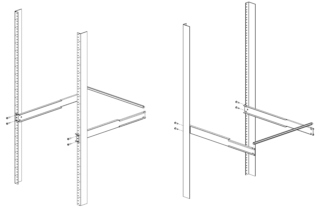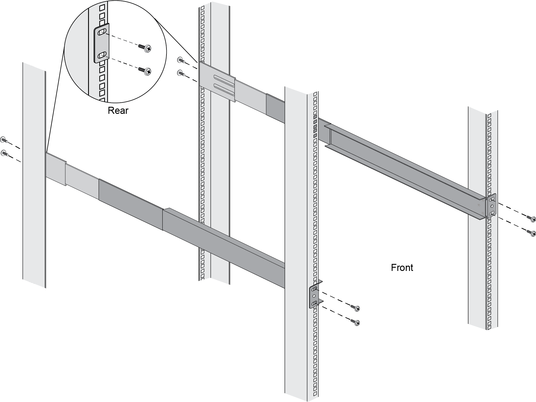 Align the bottom edge of the mounting rails to the bottom of the 1 RU rack space reserved for the device. Align the slotted holes in the adjustable mounting bracket to the holes on the rear of the equipment frame.The mounting rails are designed for equipment frames that are 26” to 32” deep.Secure the rails to the equipment frame with mounting screws (not provided) compatible with your equipment frame. Tighten the screws to their recommended torque value.