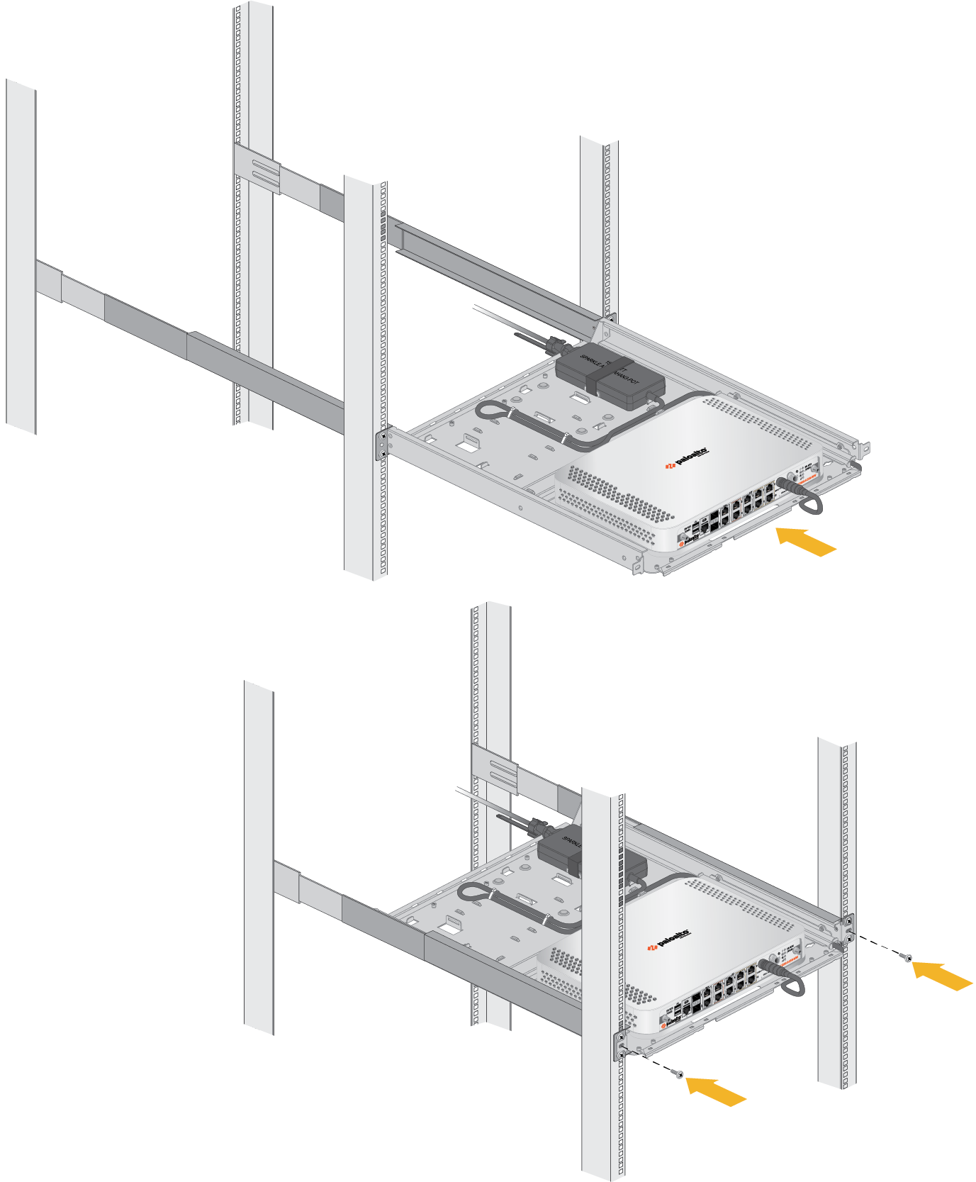 Slide the mounting tray into the rails previously fixed to the equipment rack. Stop when the front flange on the mounting tray is flush with the front of the rail.Align the slotted holes in the mounting tray to the holes in the equipment frame. Secure the mounting tray to the equipment frame on both sides using 3 screws each (not provided). The screws must be compatible with your equipment frame.