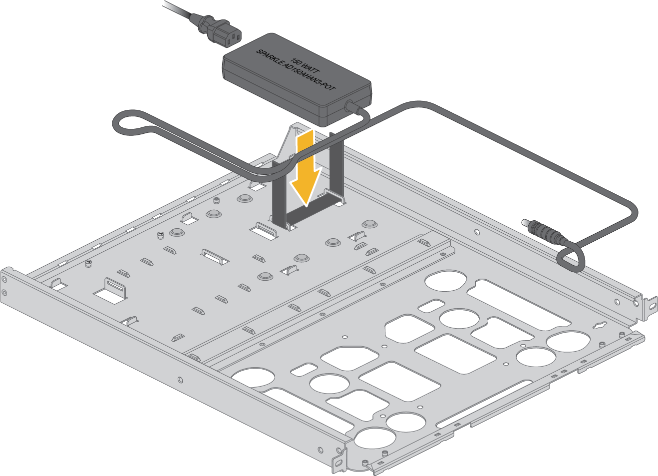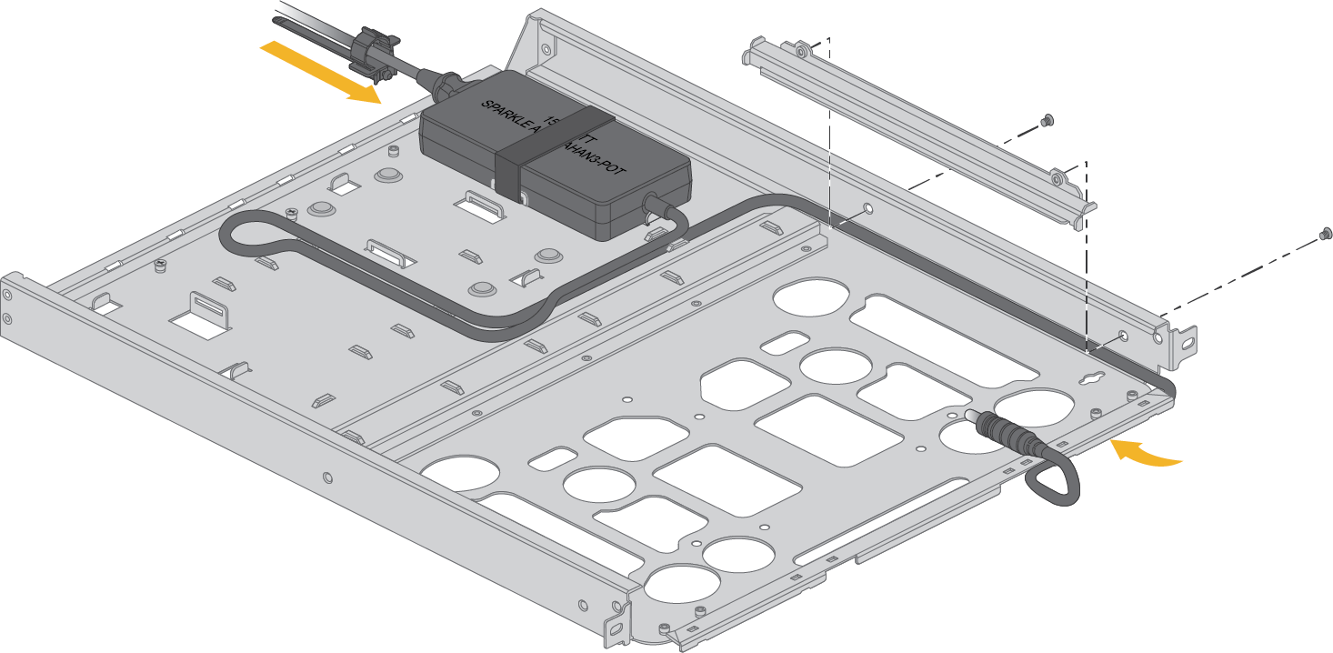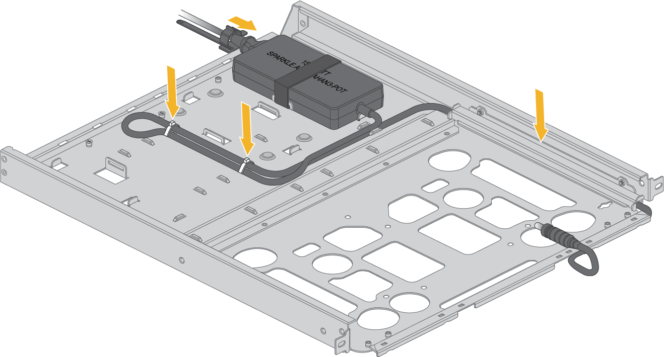 Plug the power supply connector into the back of the device. Using the provided tie-wraps, bind and secure the power supply cable toward the back end of the tray using the sheet-metal lances toward the center of the tray.