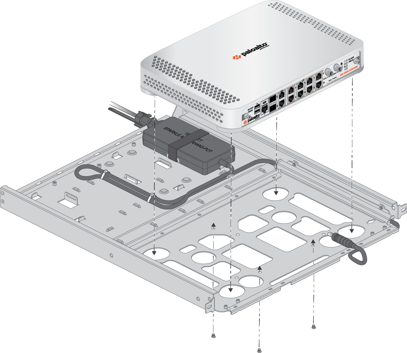 After assembling the device to the tray and connecting the power cable to the device, tie-wrap the power cord to the "C" channel.With the front of the device facing forward, align the four rubber feet on the bottom of the device to the slotted holes in the provided mounting tray. Secure the device in place using two provided #6-32 x 3/16” Long Flathead screws.