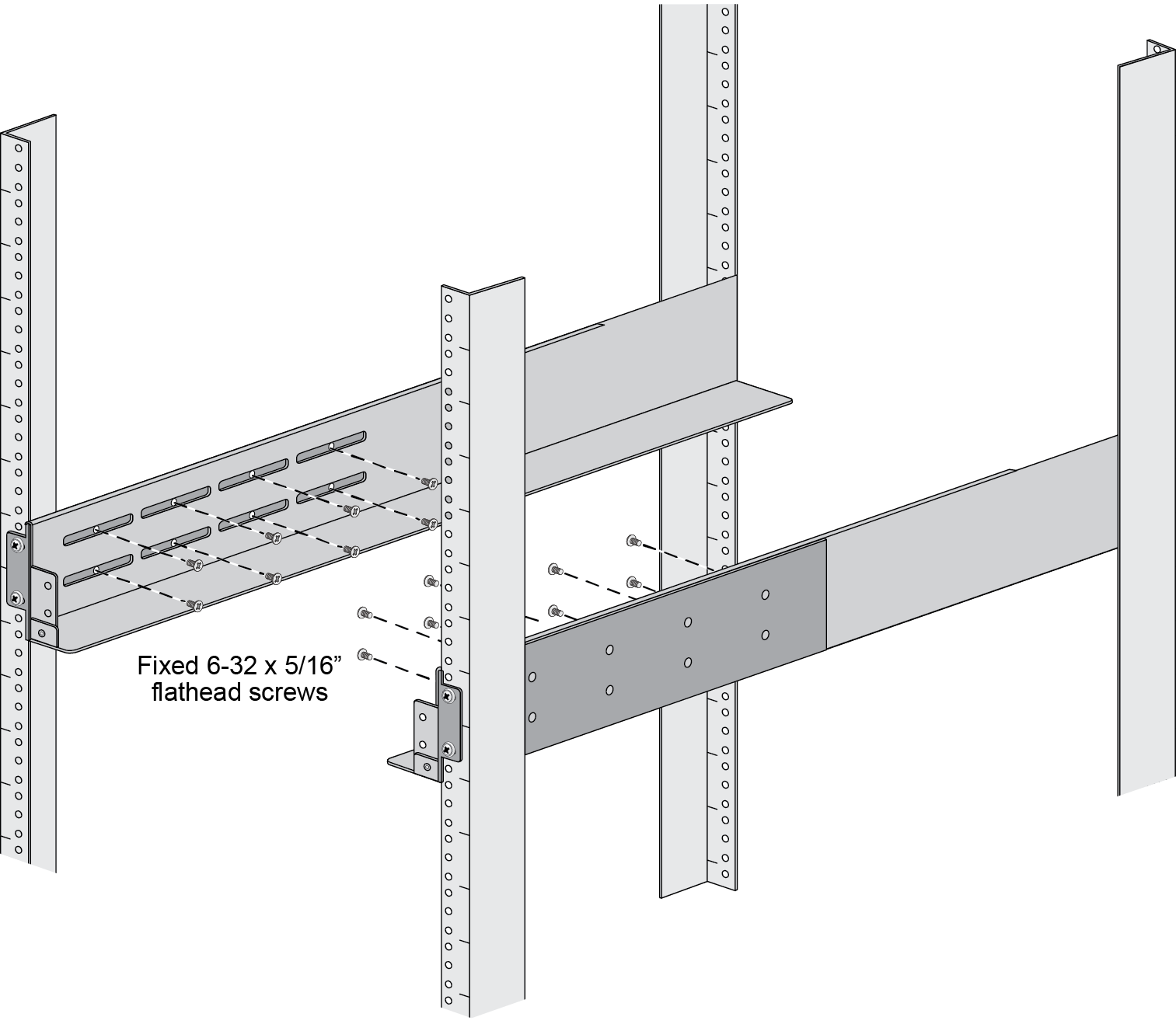 Use the provided 6-32 x 5/16 flathead screws to secure the adjustable bracket to the fixed bracket. A minimum of 6 screws are required for each side.