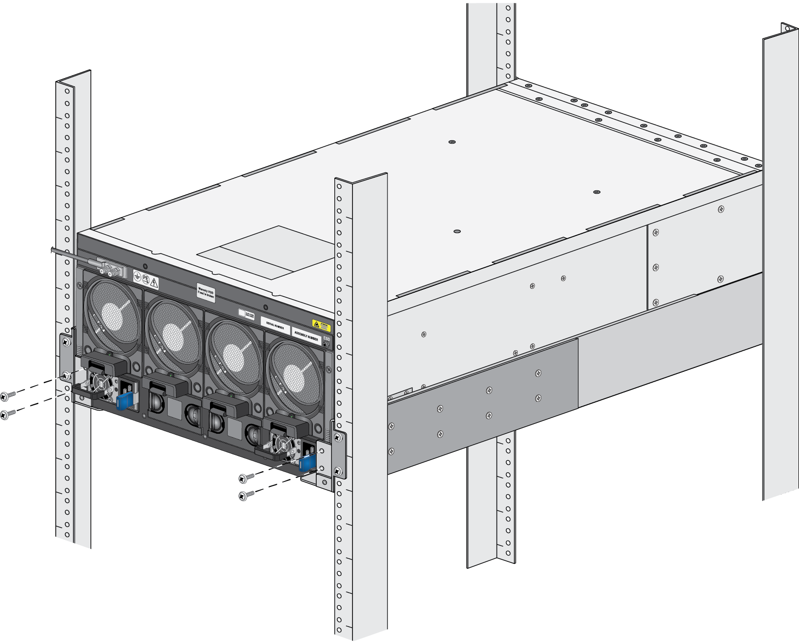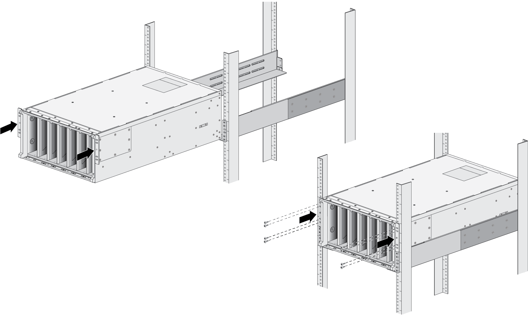 Slide the PA-5450 on the brackets that were previously mounted to the equipment frame until the front mounting flanges of the PA-5450 are flush against the mounting surface of the equipment frame.Secure the PA-5450 to the equipment frame on both sides using 8 screws each (not provided). The screws must be compatible with your equipment frame.