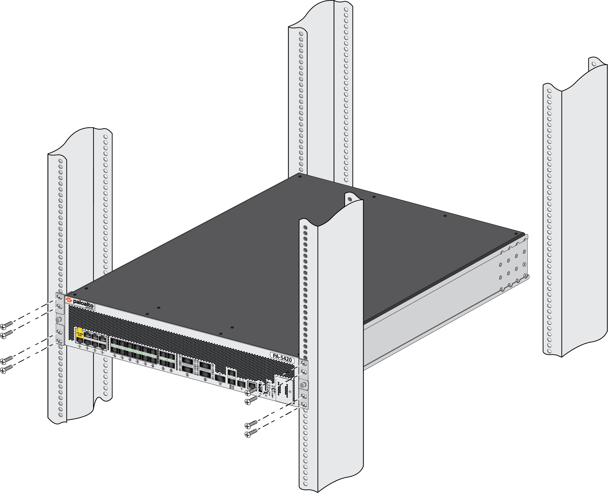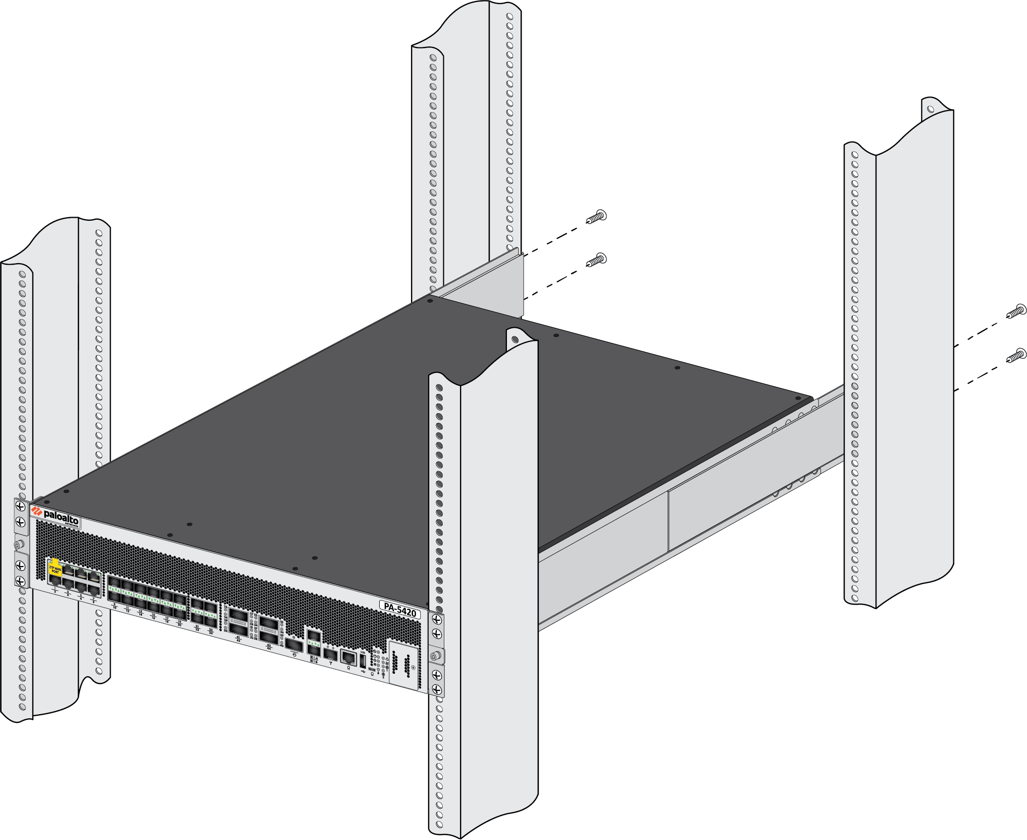 - Read PA-5400 Series Firewall Rack Install Safety Information.Attach one fixed rack mount bracket to each side of the firewall. Use four #8-32 x 5/16” screws for the front four screw holes in each bracket and three #6-32 x 5/16” screws for the back three screw holes and torque each screw to 15 in-lbs.