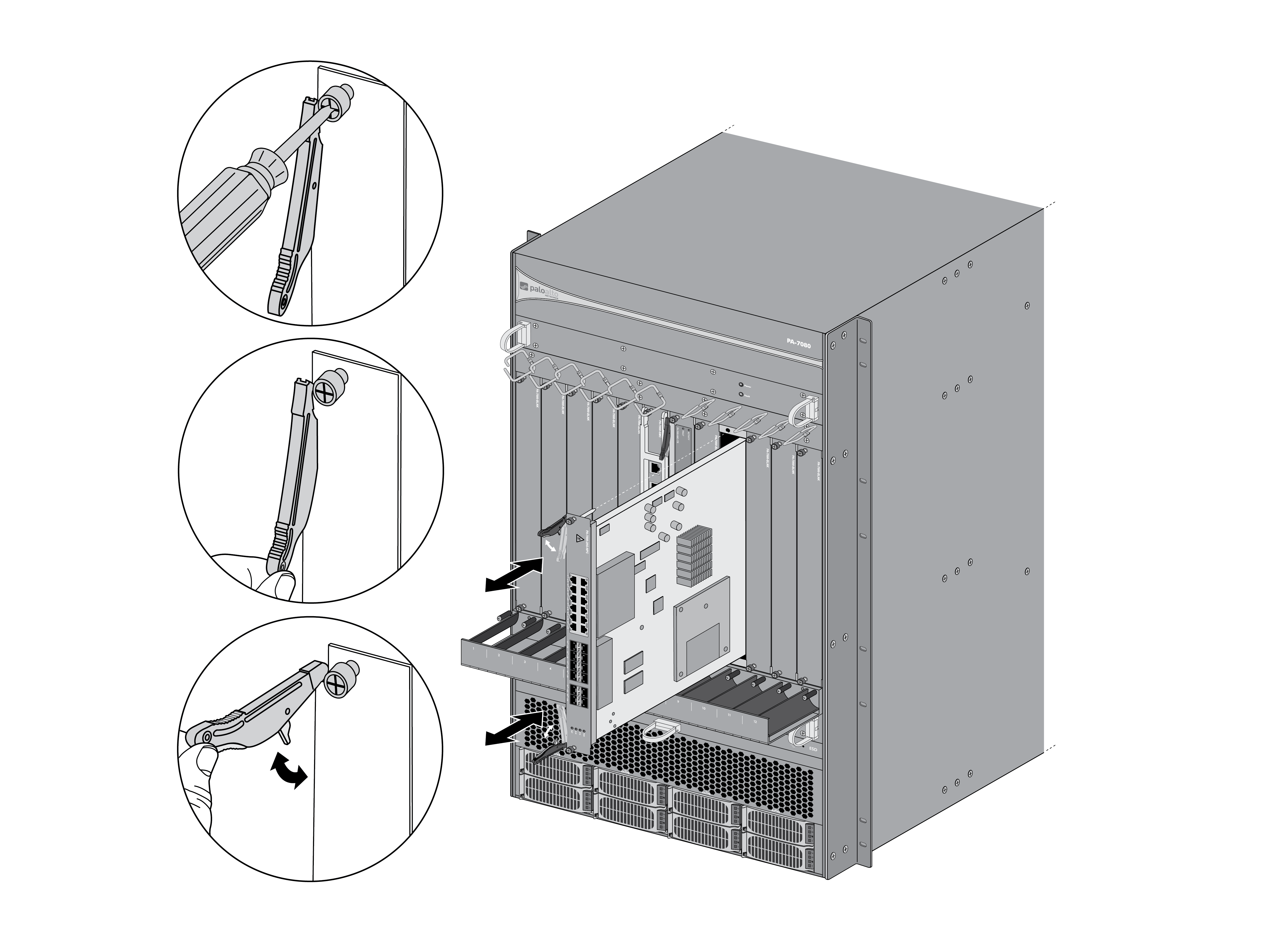 - Put the provided ESD wrist strap on your wrist ensuring that the metal contact is touching your skin. Then attach (snap) one end of the ground cable to the wrist strap and remove the alligator clip from the banana clip on the other end of the ESD grounding cable. Plug the banana clip end into one of the ESD ports located on the front of the chassis before handling ESD sensitive hardware. For details on the ESD port location, see PA-7050 Front Panel (AC) or PA-7080 Front Panel (AC).Remove the DPC from the antistatic bag and partially slide it into any of the available DPC slots, ensuring that the handles are in the open position. When the card is about 1/4-inch from being fully inserted, adjust the levers to align with the chassis and then close the levers to seat the card in place. The following images show how to install DPCs.