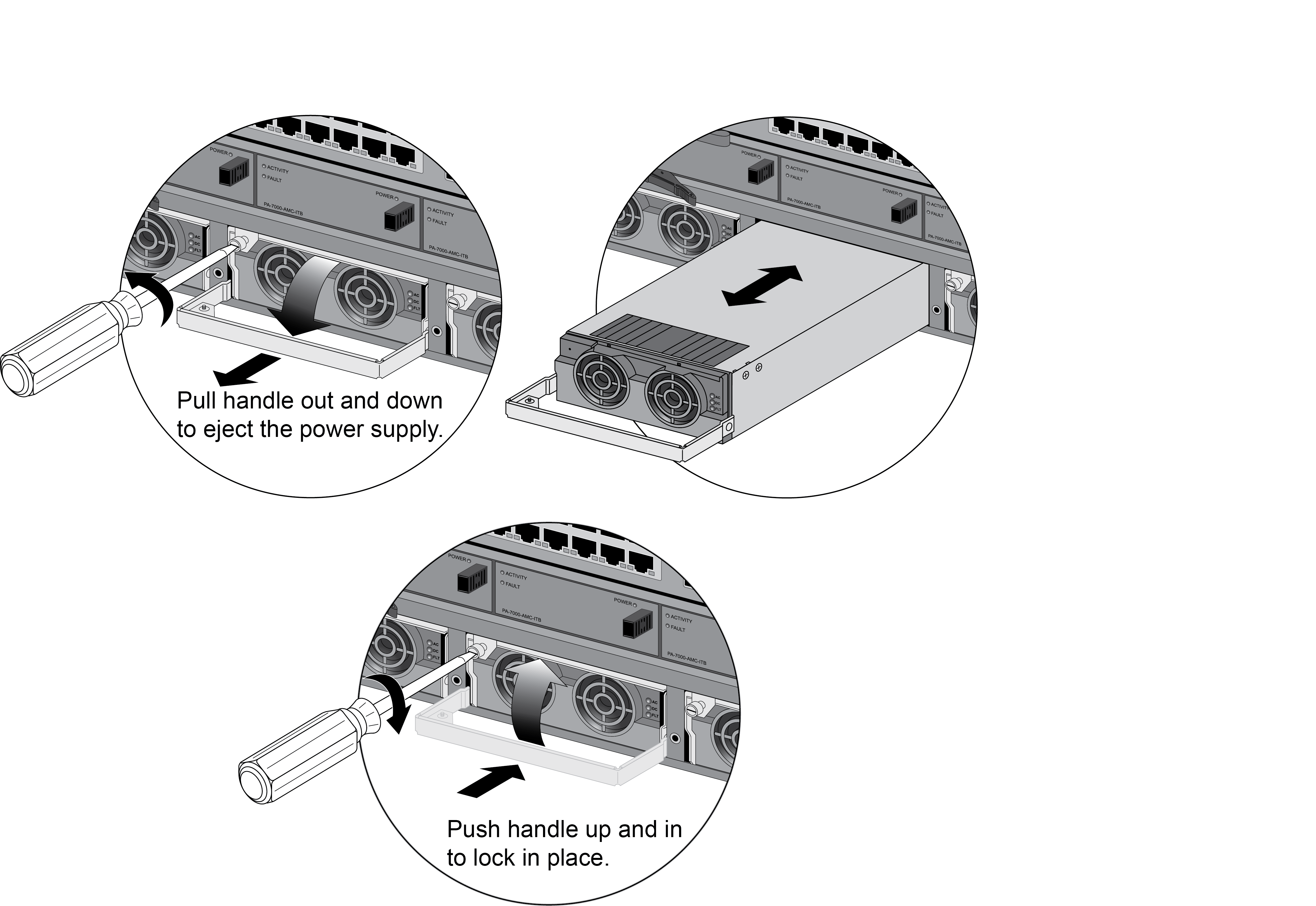 Remove the replacement power supply from the packaging and open the front ejector handle until it is fully open.Slide the new power supply into the empty power supply slot until it is almost fully seated. Ensure that the notch near the hinged part of the ejector handle lines up with the chassis, so that you can close the handle and properly seat the power supply.Tighten the upper left thumb screw on the power supply to secure the power supply.Plug the power cable into the corresponding AC power module on the back of the chassis and turn on the power switch. The new power supply turns on and the LED will turn green.