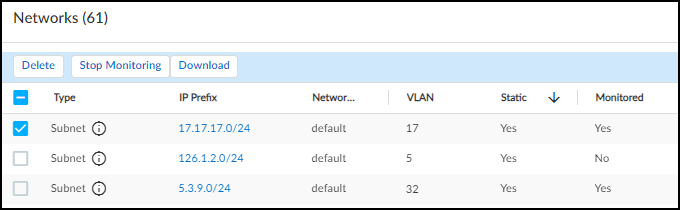 - Navigate to NetworksAll Networks and then in the Networks table, click AddUpload Subnets.Click the link to download the CSV template.Fill out the template with subnet information.Enter the following for each subnet you want to upload:prefix: Enter the IP address of the subnet in dot-decimal notation and its netmask in CIDR notation (example, 10.1.1.0/24). This appears on the Subnets page, and for a device in this subnet, the subnet and netmask appear on the Devices and Device Details pages.vlan: (Optional) Enter a VLAN ID. If entered, this also appears on the Subnets page, and for a device in this subnet, it appears on the Devices and Device Details pages.description: (Optional) Enter a description of the subnet/VLAN, perhaps noting the type of devices for which it’s intended. These special characters are not allowed in the description field: ~ ` ! # $ % ^ & * + = { } [ ] | \ < > ? This description only appears on the Subnets page.static: Enter yes to define this as a subnet containing static IP addresses. When Device Security discovers a device from a user-configured static IP subnet in a different L2 domain from the firewall and adds it to its inventory, the Source column on the Devices page shows User-Configured. (Leave it blank if you do not want the subnet to be static).monitored: Enter yes if you want Device Security to provide device profiling, behavioral analysis, and risk monitoring of the devices in this subnet. Leave it blank if you only want Device Security to detect the devices in the subnet and perform a simplified device identity analysis. Based on this field, the Device Security portal displays Yes or No in the Monitored column in the Networks table on NetworksNetworks and SitesNetworks tab and provides the appropriate level of device monitoring, analysis, and protection.The Add a subnet option does not provide an option to specify a subnet as monitored or unmonitored. Device Security automatically classifies an added subnet as monitored. However, you can change its classification after you add it by selecting the subnet and clicking Stop Monitoring in the Networks table. You can also make multiple selections to stop monitoring multiple subnets at the same time. Later you can select unmonitored subnets and click Start Monitoring above the table.