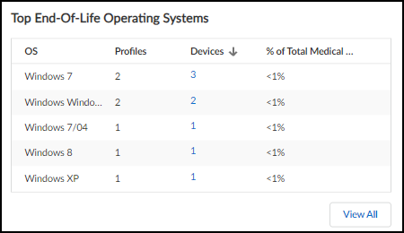 - Top End-of-Life Operating Systems: These are devices running an OS version that the vendor no longer supports with patch updates, making them more vulnerable to attack. The table shows how many device profiles have devices with an end-of-life OS and the percent of affected medical devices relative to all medical devices. Clicking a number in the Devices column opens the Assets Inventory page filtered to show only devices running this operating system and version.