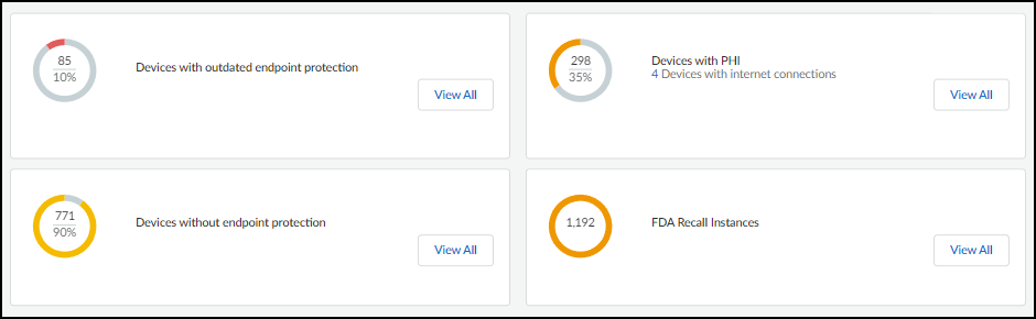 Devices with outdated endpoint protection: These are devices that have endpoint protection, such as anti-virus protection, but they haven't communicated with their vendor and haven't been updated in over a month. This makes them vulnerable to new types of attacks released since their last update.Devices without endpoint protection: These are devices that do not have any endpoint protection installed on them.Devices with PHI: These devices contain personal health information (PHI).FDA Recall Instances: This shows the total number of devices that have been issued a recall order by the Food and Drug Administration (FDA) because of a product flaw that affects safety and requires it to be fixed or replaced.
