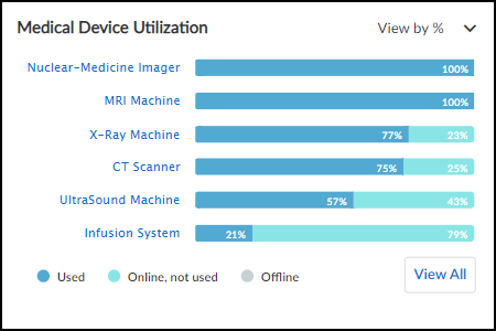- Medical Device Utilization: This panel shows all medical IoT categories and how the devices in each one are being utilized. A bar chart shows the percentages of time the devices in a category are detected in use, online but not in active use, and offline. Hover your cursor over a bar to see a pop-up with numbers for each kind of utilization. Click a medical device category to open the Assets Inventory page in a new browser tab or window. The page is filtered to show devices in the selected category.