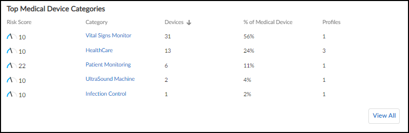 - Top Medical Device Categories: This panel lists the medical device categories and ranks them by device count, with those that contain the largest number of medical devices at the top. Clicking a category name opens a new browser window displaying the Assets Inventory page filtered to show just entries matching this category. Clicking View All in the lower right opens the Assets Inventory page filtered to show all medical devices.