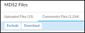 - On the VulnerabilitiesMDS2 page, click <number> Files Available in Community.The VulnerabilitiesMDS2MDS2 Files page opens with two tabs: one for the files you uploaded (Uploaded Files) and one for files shared in the community (Community Files).