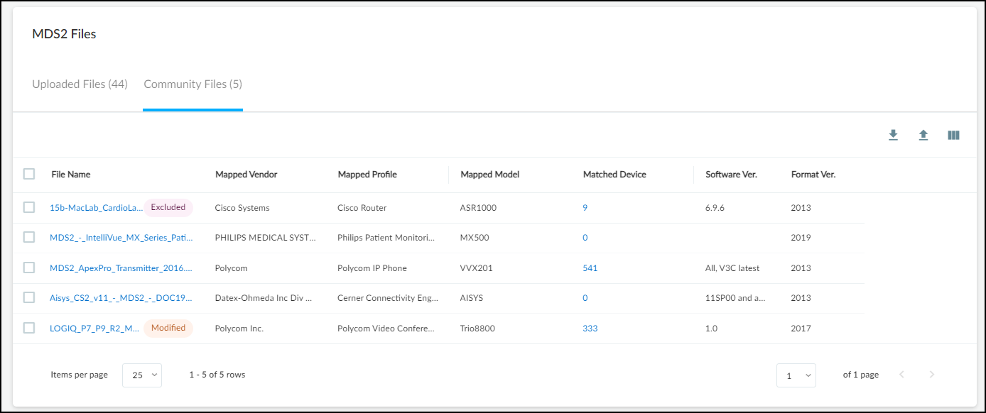 If there are shared MDS2 files that you don’t want Device Security to apply to your devices, exclude them.You might not want Device Security to apply one or more community files to your medical IoT devices, perhaps because you prefer a different version for some reason. In this case, you can exclude them from the automatic selection process.- Select VulnerabilitiesMDS2MDS2 FilesCommunity Files, select the check box of an MDS2 file you want to exclude from the automatic selection process.Exclude and Download buttons appear above the table.