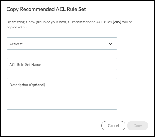 Create a new ACL rule set based on the recommended set.You can also click + to create a new rule set based on the recommended rule set or on another one you’ve previously defined. When creating a new rule set, you have the same options explained below with the additional option of copying rules from a set of your choice.- Click Copy.The Copy Recommended ACL Rule Set dialog box appears.