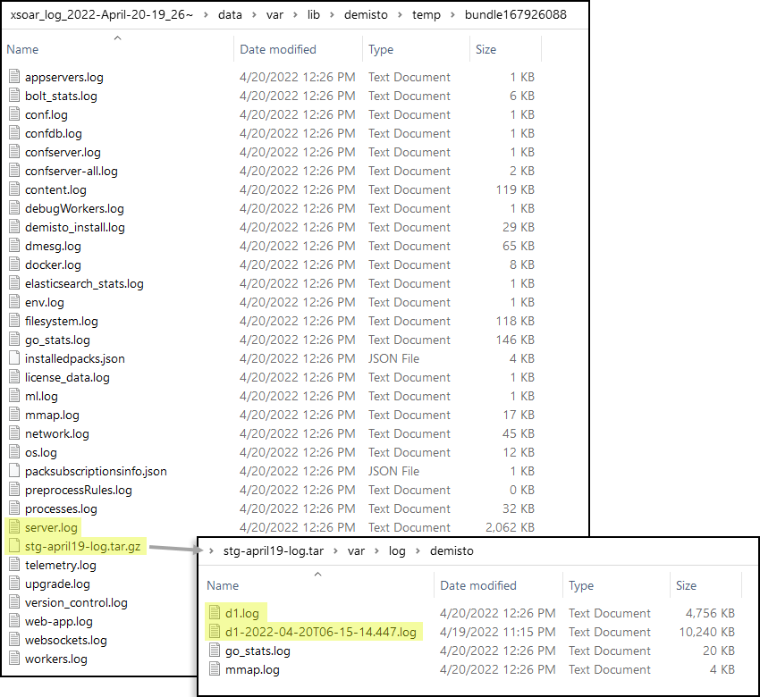 In the above screen capture, there are two d1.log files. When a file reaches its maximum size of 10 MB, XSOAR saves the first d1.log file with a timestamp as part of its filename and starts making a new d1.log file.