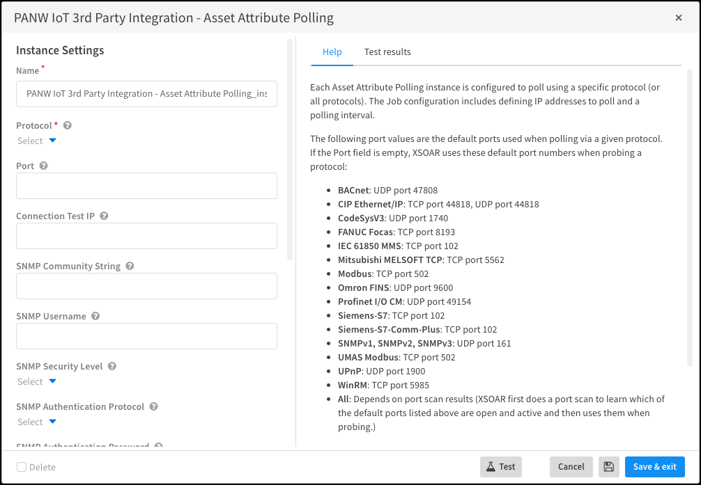 - Enter the following settings:Name: Use the default name of the instance or enter a new one.Remember the instance name because you're going to use it again when creating a job that Cortex XSOAR will run to gather device attributes.Protocol: Choose the protocol you want to use for device polling. If you choose All, XSOAR first performs a port scan using the default port numbers of each protocol to learn which devices have these ports open and are actively responding. It then uses whichever protocols elicited a response when polling.Port: Leave the field empty to use the default TCP or UDP port numbers or enter a custom port number.When you enter a custom port number, XSOAR polls devices on that port using the same TCP and UDP transports it uses to poll with the default port number.When polling with SNMPv1 or SNMPv2, enter an SNMP community string that matches the one on the devices to be polled. When polling with SNMPv3, enter a username, and choose a security level (noAuthNoPriv, authNoPriv, or authPriv). Then depending on the security level chosen, enter an authentication protocol (MD5 or SHA), authentication password, privacy protocol (DES or AES), and privacy password. When the security level is noAuthNoPriv, enter just an SNMP username; a password is unnecessary. For information about these settings, see Set up Device Security and Cortex XSOAR for SNMP Discovery.When polling with WinRM, enter a WinRM username and password.Run on Single engine: Choose the XSOAR engine that you want to poll devices. When using an on-premises XSOAR server that does not require an XSOAR engine, leave this field empty.