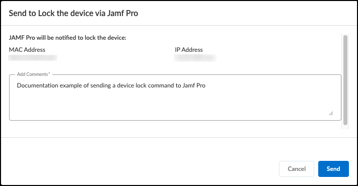 In the Lock the device via Jamf Pro pop-up that appears, verify that the MAC address and IP address are for the device that you want to lock, and then add a comment.