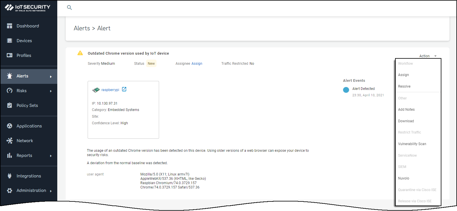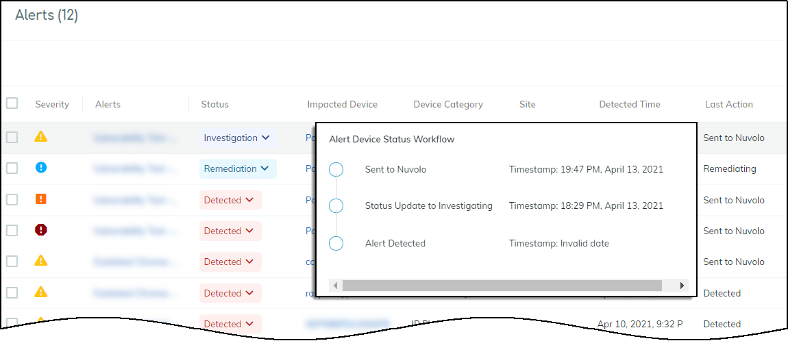 - To confirm that the work order was sent, click the link to the XSOAR playbook for this action.For the link in Device Security to open the corresponding playbook in Cortex XSOAR, you must already be logged in to your XSOAR instance before clicking it.The green boxes in the playbook indicate that a particular step was successfully performed. Following the path through the playbook gives you feedback about whether an action was carried out successfully or, if not, where the process changed course.Also the action “Sent to Nuvolo” appears in the Last Action column on the Alerts page in the Device Security portal. If you don’t see this column, click the Columns icon () and select Last Action.![]()  ![]()