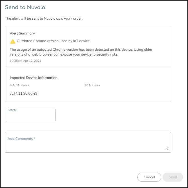 - Log in to the Device Security portal and send a Security alert to Nuvolo.- Click AlertsSecurity Alerts, select the check box of the alert you want to send as an incident to Nuvolo, and then click MoreSend toNuvolo.![]() OrClick AlertsSecurity Alerts, click the name of a Security alert, click ActionNuvolo. OrClick AlertsSecurity Alerts, click the name of a Security alert, click ActionNuvolo.![]() The Send to Nuvolo panel appears. The Send to Nuvolo panel appears.![]()
