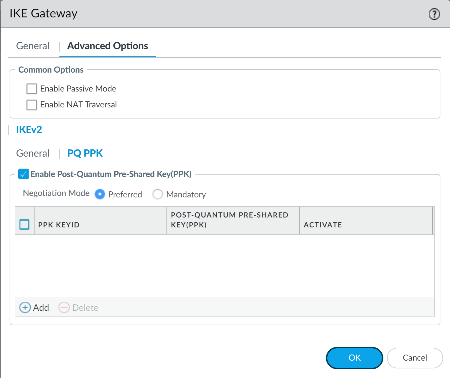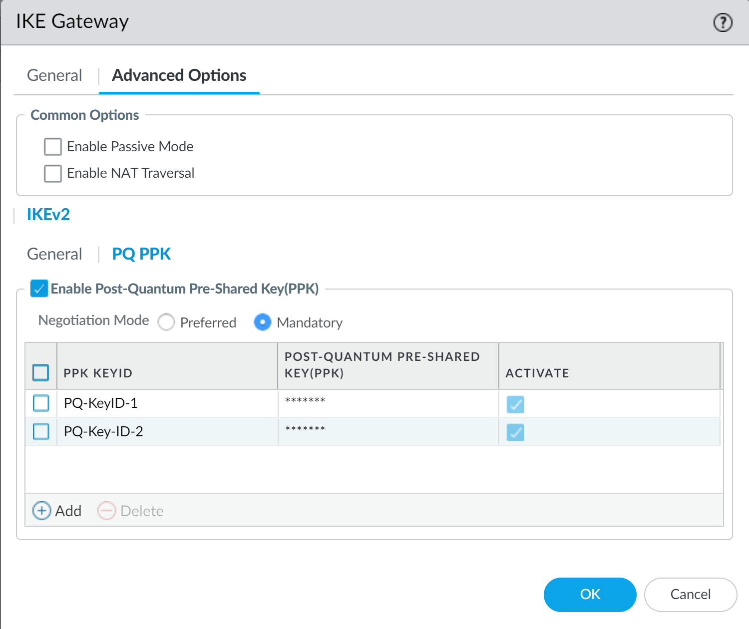 By default, the new key is active. If you don't want to use the key in negotiation between IKE peers, deselect Activate. If you deactivate the PQ PPK on one peer, you must also deactivate it on the other peer.Click OK to install the firewall-generated PQ PPK.If Panorama manages both peers, you can create the configuration on Panorama and push it to the managed firewalls. If Panorama doesn't manage both peers and a different administrator controls the VPN peer, you securely communicate the PQ PPK to that administrator, who installs it on the peer.For Site A and Site C, the two PQ PPKs created in this example are listed as active PQ PPKs in Mandatory mode.