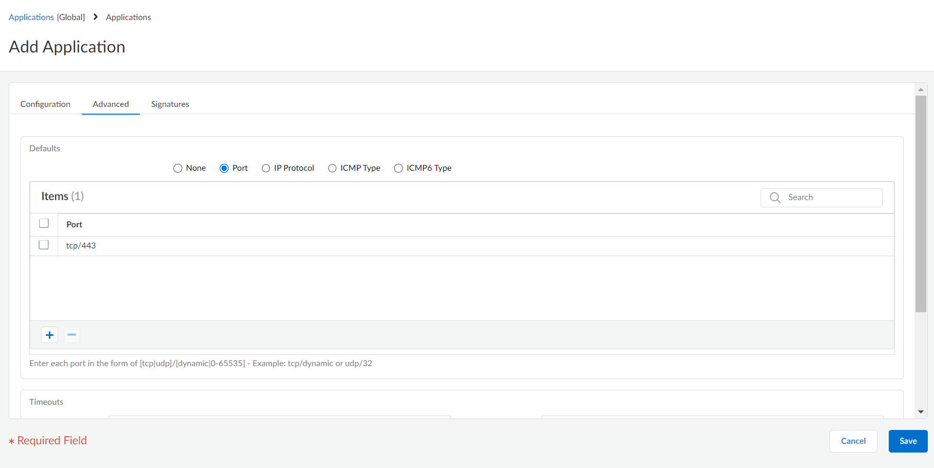 Define details about the application, such as the underlying protocol, the port number the application runs on, the timeout values, and any types of scanning you want to be able to perform on the traffic.On the Advanced tab, define settings that will allow the firewall to identify the application protocol:- Specify the default ports or protocol that the application uses.