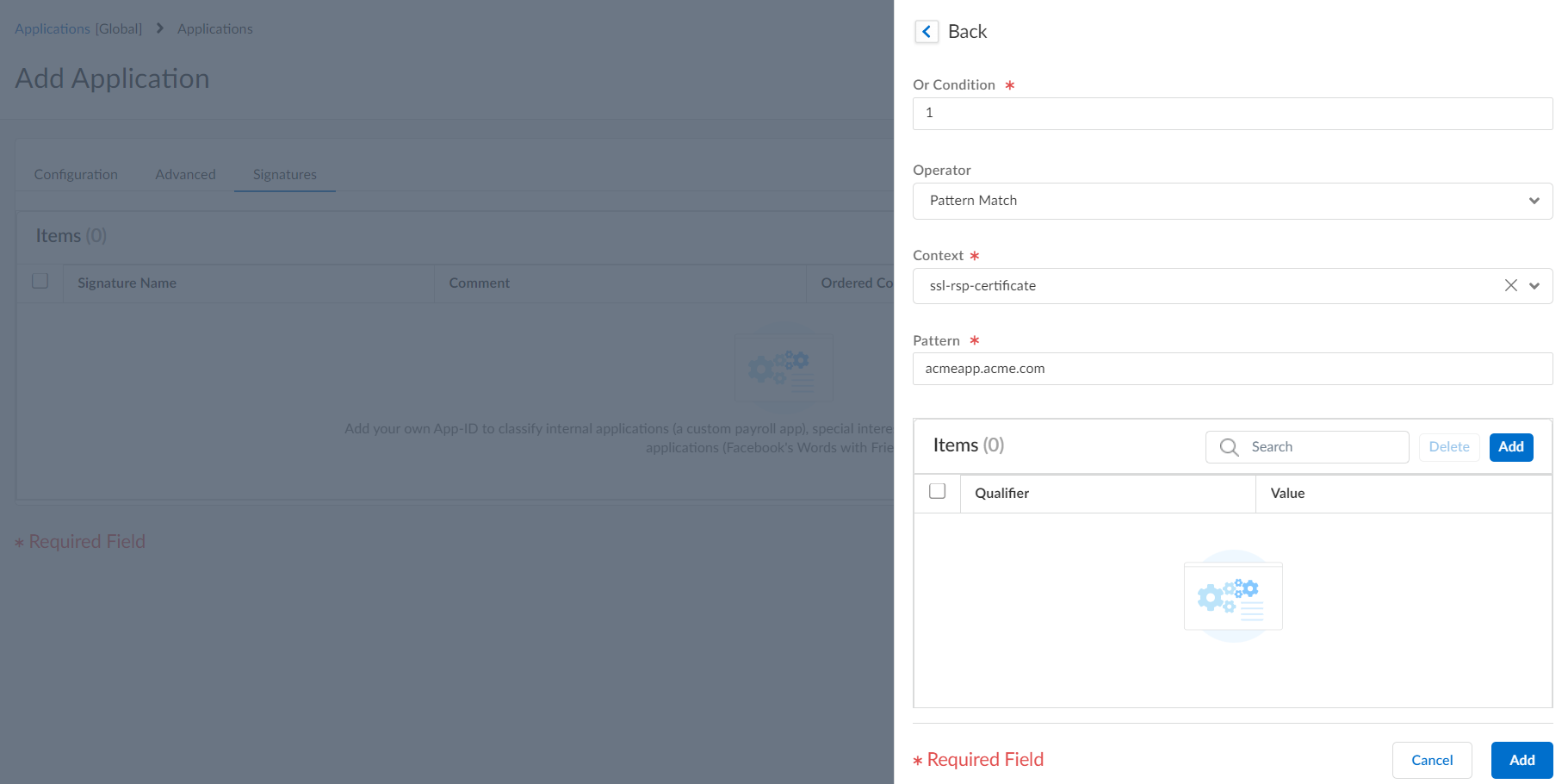 Repeat steps 4.c and 4.d for each matching condition.If the order in which your configuration attempts to match the signature definitions is important, make sure the Ordered Condition Match check box is selected and then order the conditions so that they are evaluated in the appropriate order. Select a condition or a group and select the Up Arrow or Down Arrow. You can't move conditions from one group to another.Select Add to save the signature definition.Save the application.Validate that traffic matches the custom application as expected.- Select ConfigurationNGFW and Prisma AccessSecurity ServicesSecurity Policy and select Add Rule add a Security security rule to allow the new application.Run the application from a client system and then check the Traffic logs (Incidents & AlertsLog ViewerFirewall/Traffic) to make sure that you see traffic matching the new application (and that it's being handled per your policy rule).(Optional) Add tags to your custom application. Keep in mind, this cannot be done during the initial creation of the custom application.