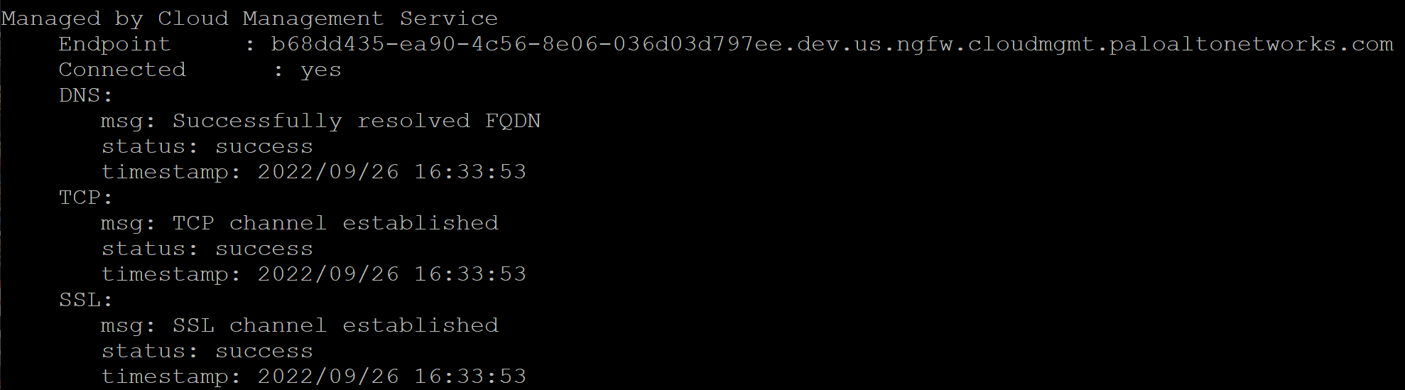 admin> show cloud-management-status![]() Verify the firewall successfully connected to a Strata Cloud Manager Endpoint and that the Connected status displays Yes.Once the firewall is Connected, the firewall automatically converts to logical router mode and restarts, and Strata Cloud Manager pushes the default configuration to the firewall. Verify the firewall successfully connected to a Strata Cloud Manager Endpoint and that the Connected status displays Yes.Once the firewall is Connected, the firewall automatically converts to logical router mode and restarts, and Strata Cloud Manager pushes the default configuration to the firewall.