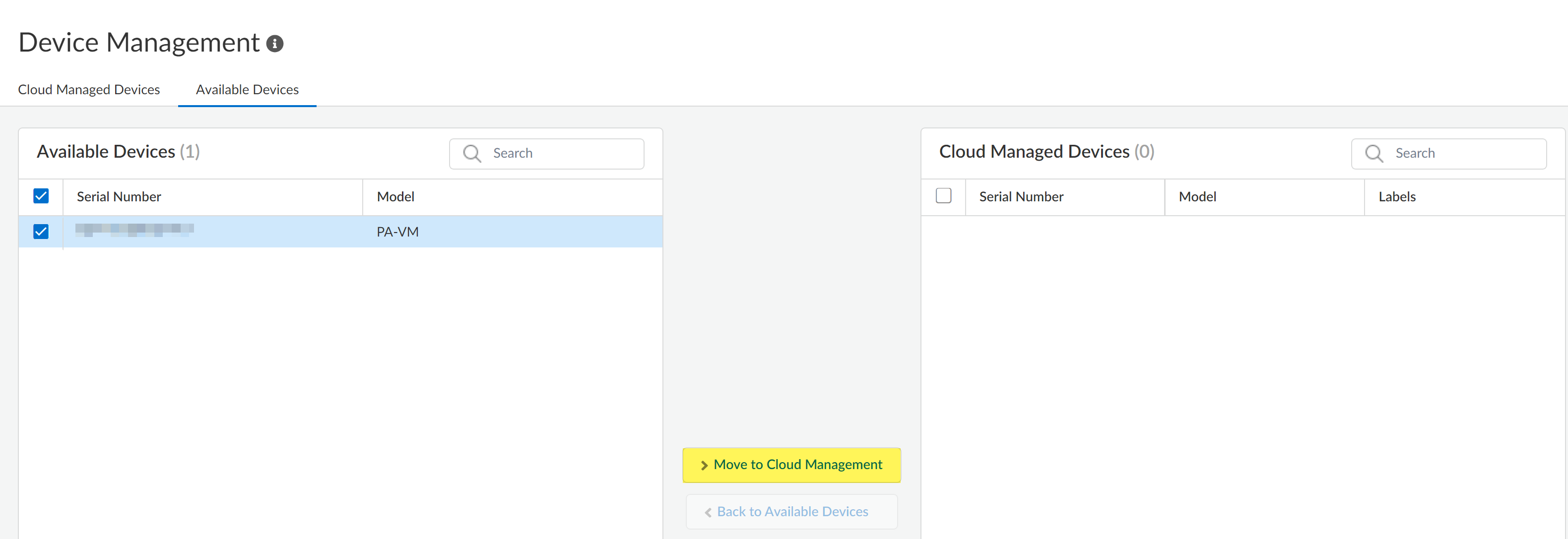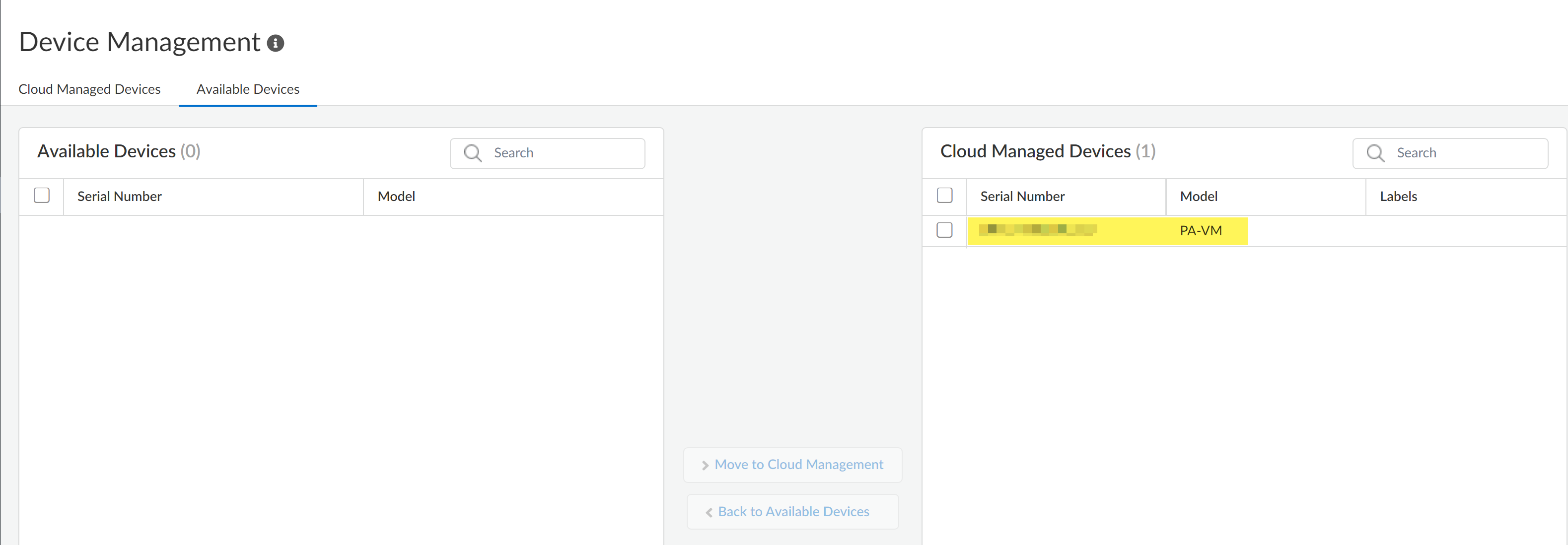 - Move to Cloud Management.You are prompted to confirm the number of selected firewalls. Click Move to Cloud Management to continue.![]()