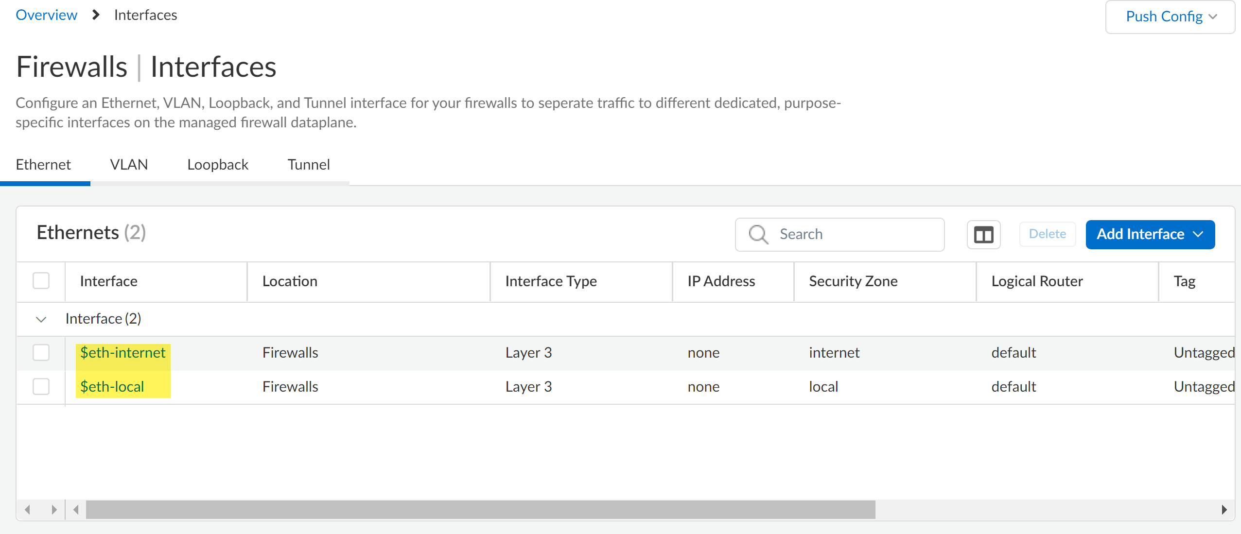 The predefined interface and logical router configuration are associated with the default All Firewalls folder and are inherited by all other folders you create. You might reassign the $eth-internet and $eth-local interfaces for a newly created folder or for the individual firewall as needed.- Select ManageConfigurationDevice SettingsInterfacesEthernet and verify that