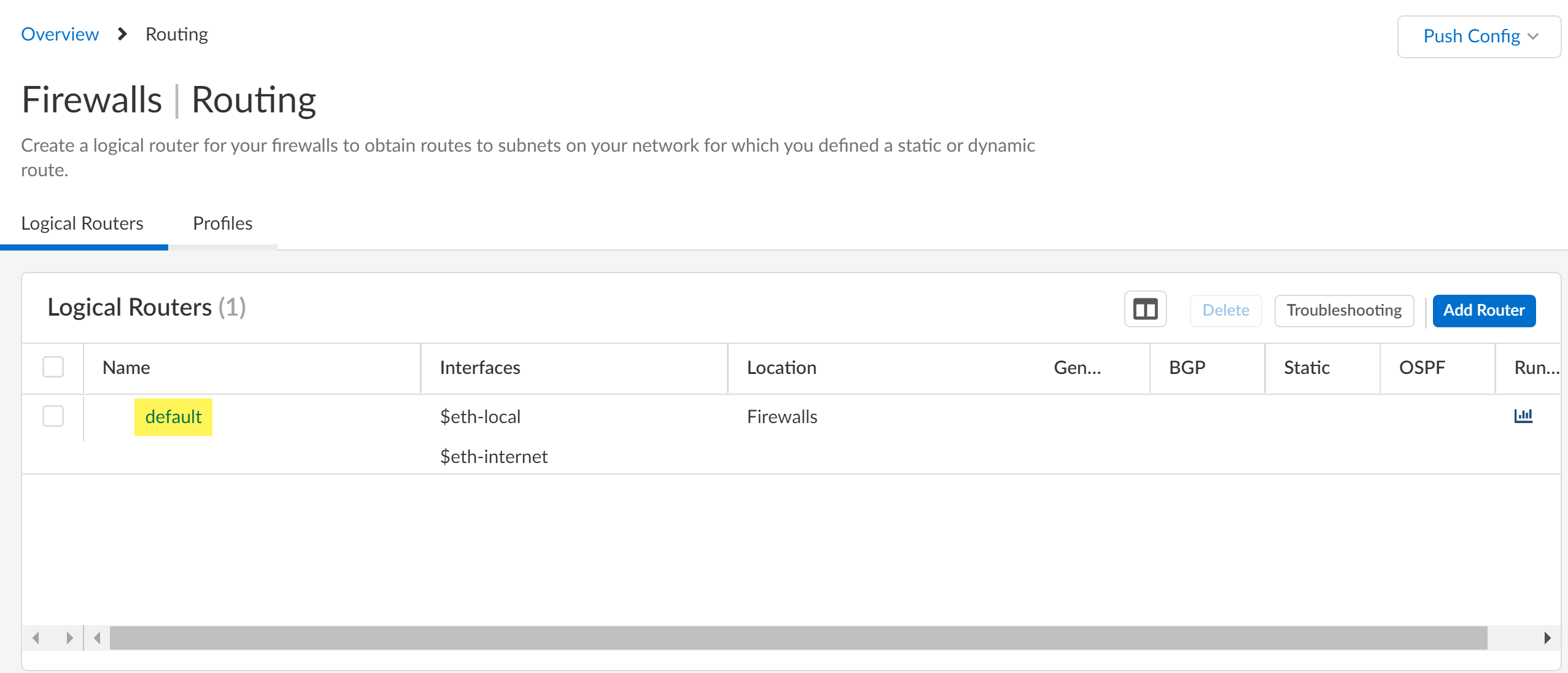 - Select ManageConfigurationDevice SettingsRoutingLogical Routers and verify the default