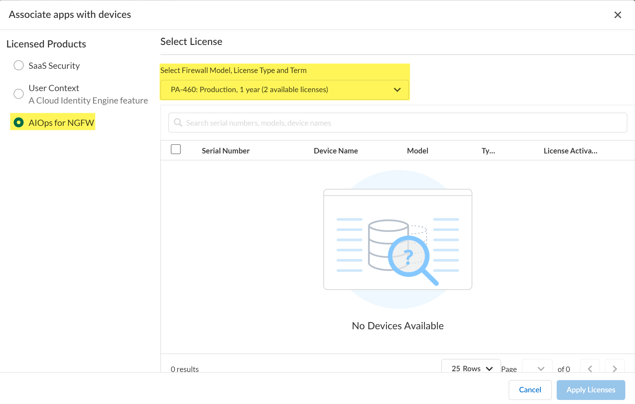 - For the Licensed Products, select AIOps for NGFW.