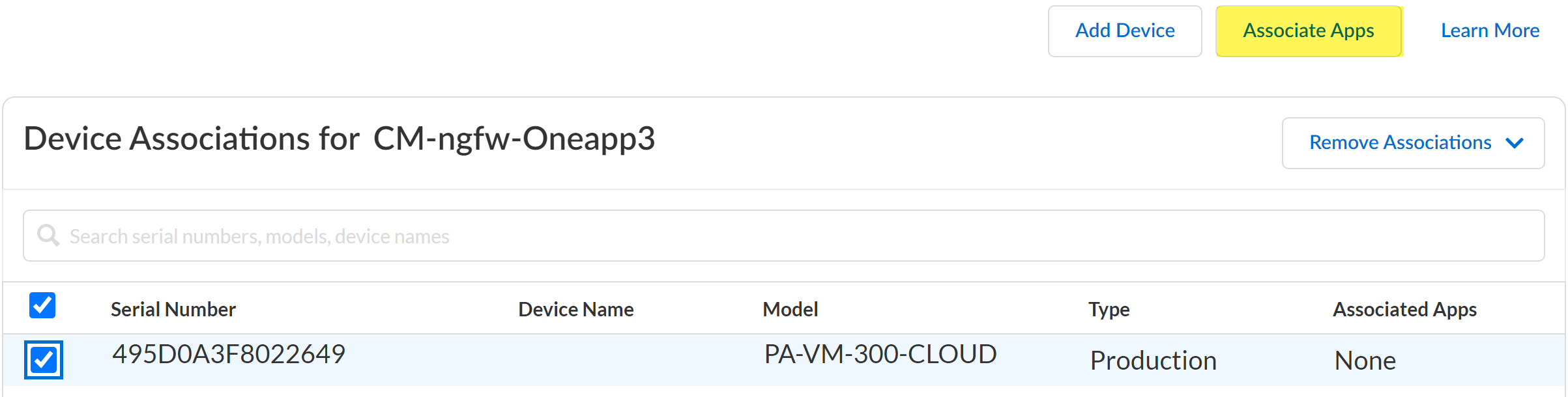- In the Device Associations page, verify the Associated Apps for the