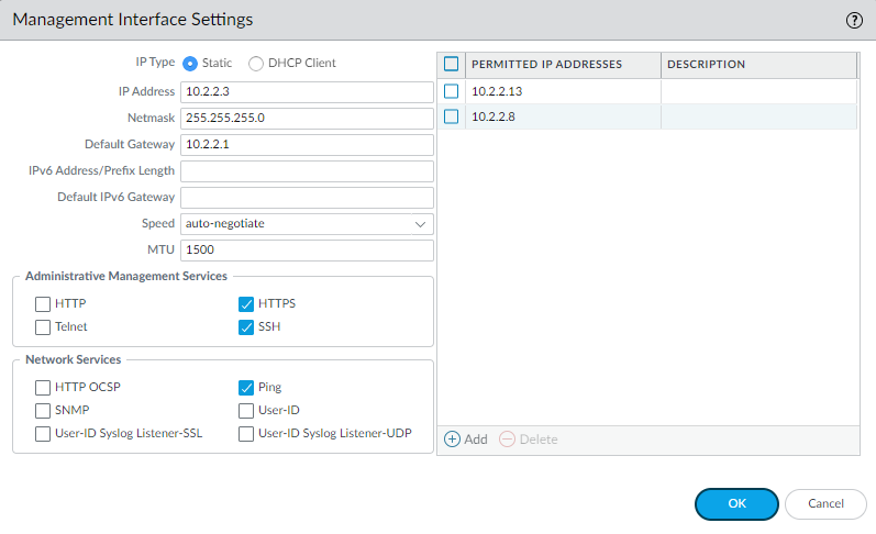 - Select which management services to allow on the interface.Make sure Telnet and HTTP are not selected because these services use plaintext and are not as secure as the other services and could compromise administrator credentials.