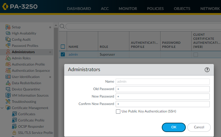 - Set a secure username and password for the admin account.Starting with PAN-OS 9.0.4, the predefined, default administrator password (admin) must be changed on the first login on a device. The new password must be a minimum of eight characters and include a minimum of one lowercase and one uppercase character, as well as one number or special character. Although you don’t have to configure a new username, it is a best practice to do so and to use unique usernames and passwords for each administrator. Beginning with PAN-OS 10.2, the login must include at least one alphabetical character or symbol (underscore, period, or hyphen, although a hyphen cannot be the first character in the username) and cannot be numbers only.Be sure to use the best practices for password strength to ensure a strict password and review the password complexity settings.