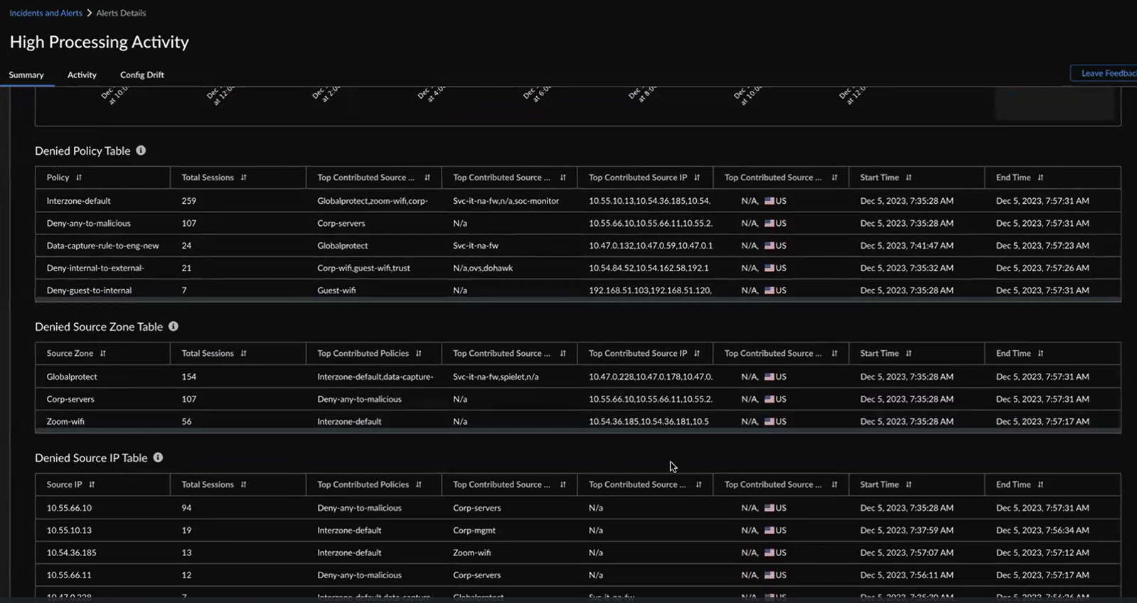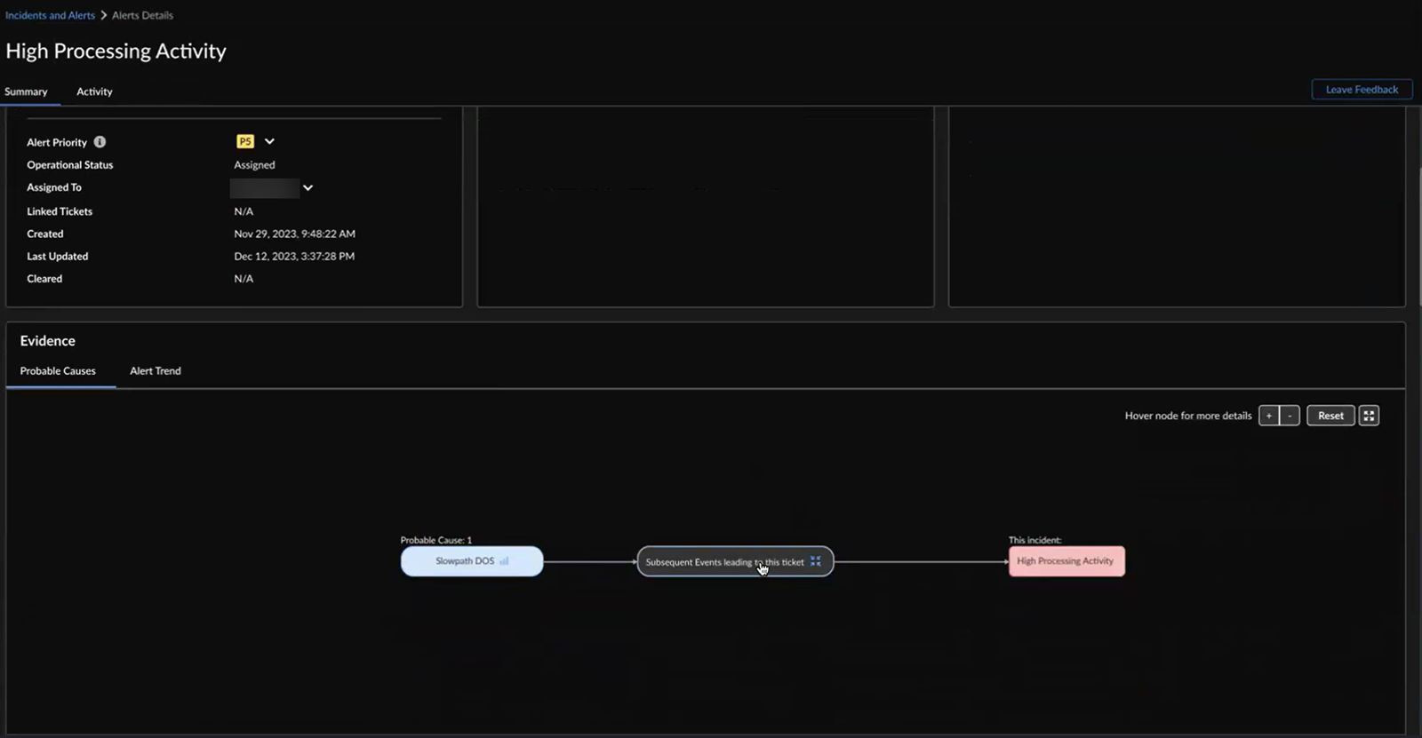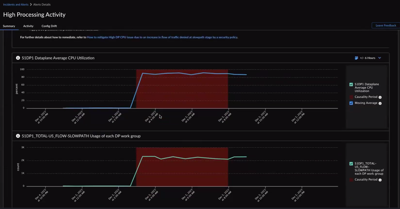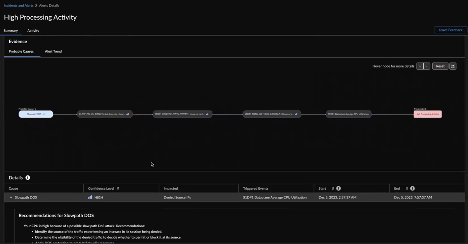 You can view 6 hours, 24 hours, or 48 hours before and after the impact in the graph.The probable cause analysis is enhanced to use the SLS logs and provide additional metadata to the probable cause that led to the creation of an alert or incident. This enhancement allows you to pinpoint the policies, applications, source zones, URLs, source IPs, and regions potentially causing the alert. For example, when the high dataplane CPU usage triggers a High Processing Activity alert, you can utilize the probable cause analysis to identify the primary contributors to the alert and follow the suggested remediation recommendations.