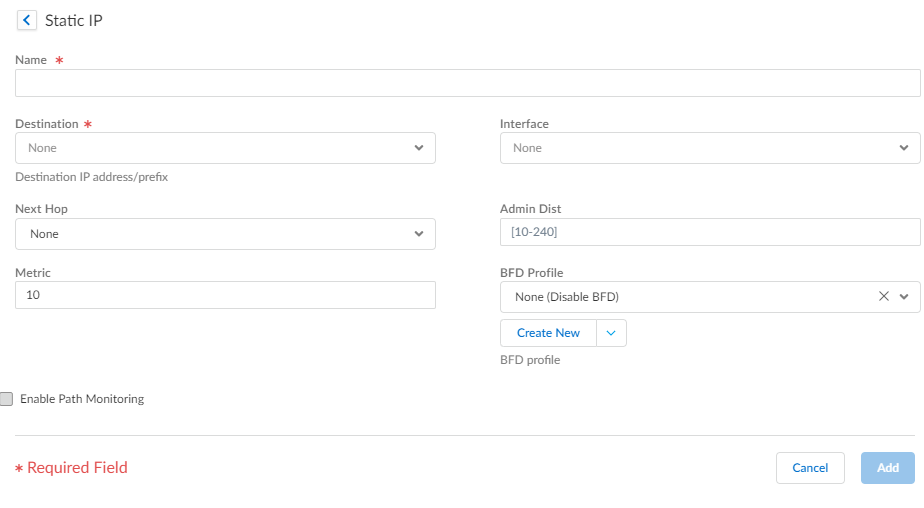 Enter the Admin Dist for the static route (range is 10 to 240; default is 10). This value overrides the Static IPv6 administrative distance specified for the logical router.Enter a Metric for the static route (range is 1 to 65,535; default is 10).If you want to use BFD, select a BFD Profile or Create New BFD profile.Add the static route.Save the configuration.